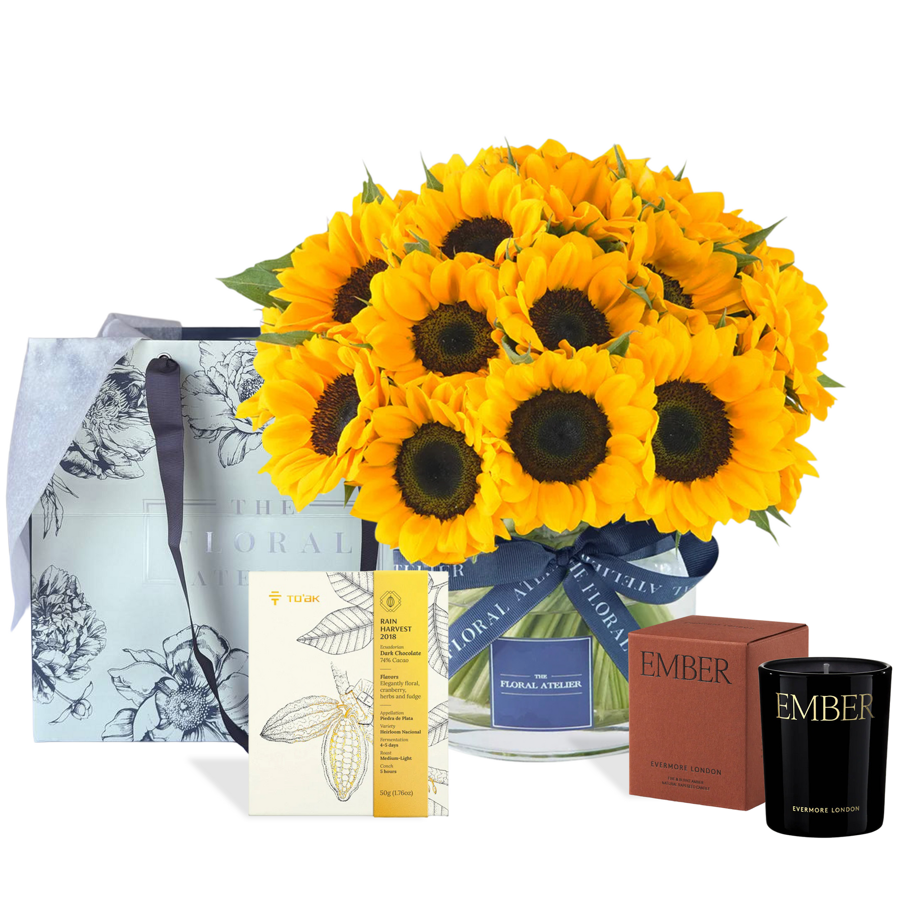 Brighten someone's day with our Sun is Shining Gift Set! Featuring the joyful Yellow Modern Vase Arrangement filled with radiant sunflowers, this set is a cheerful reminder that you’re thinking of them. The warm glow of the EVERMORE Ember Candle, with its cosy amber and sandalwood notes, creates a welcoming atmosphere. To’ak’s Rain Harvest 2018 Chocolate adds a delectable touch, making this gift set a delightful way to spread happiness.