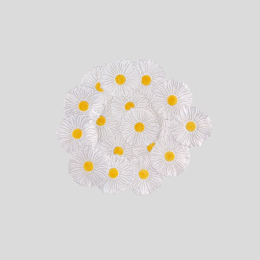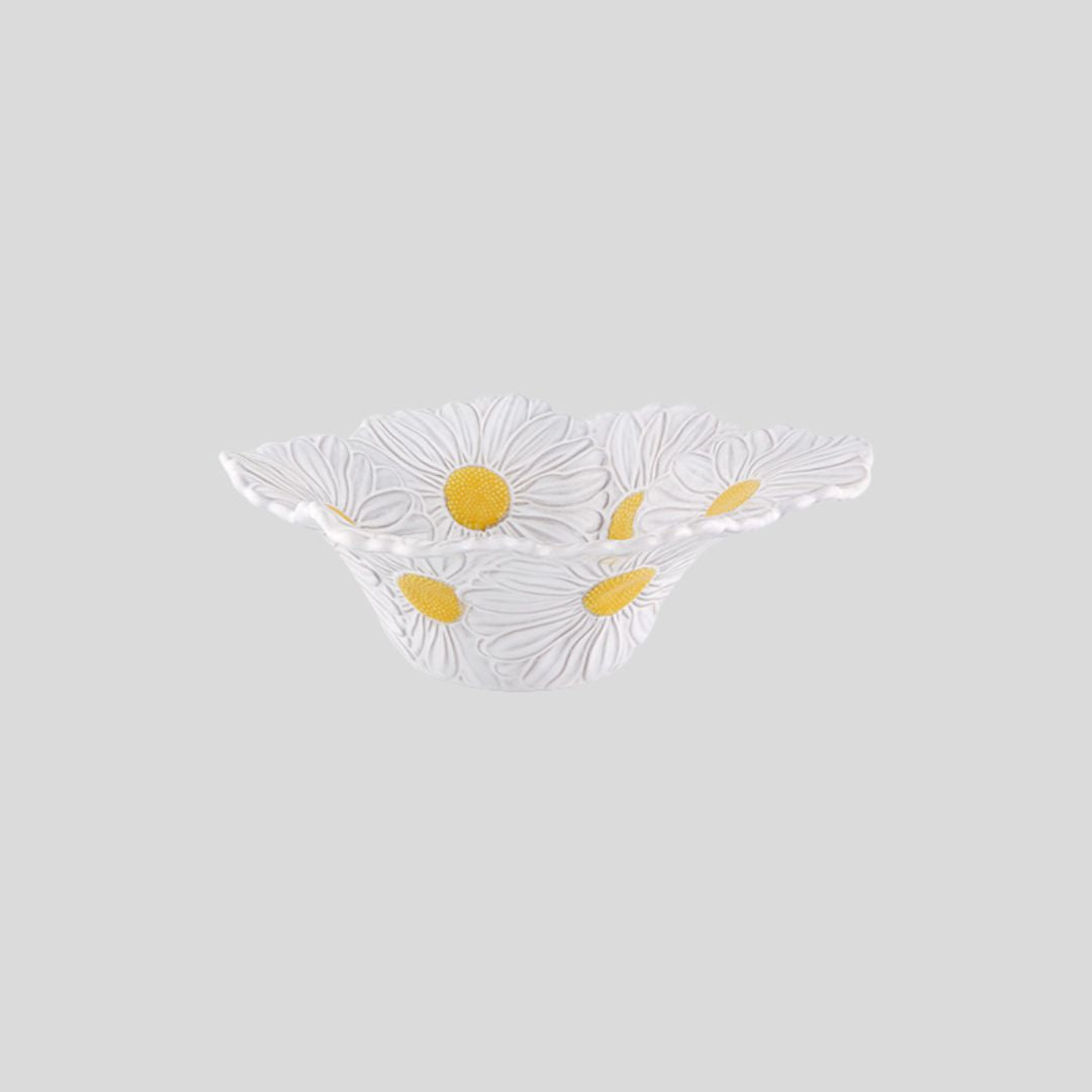 Elevate your dining with the Maria Flor Small Salad Bowl, a stunning blend of contemporary design and Bordallo Pinheiro's rustic heritage. Crafted from earthenware, it beautifully mimics a gathering of daisies, with textured white petals and a hand-painted yellow center. Perfect for side salads, fruit, or individual portions, this sculptural piece combines functionality with artistic elegance, embodying the Maria Flor collection's charm.