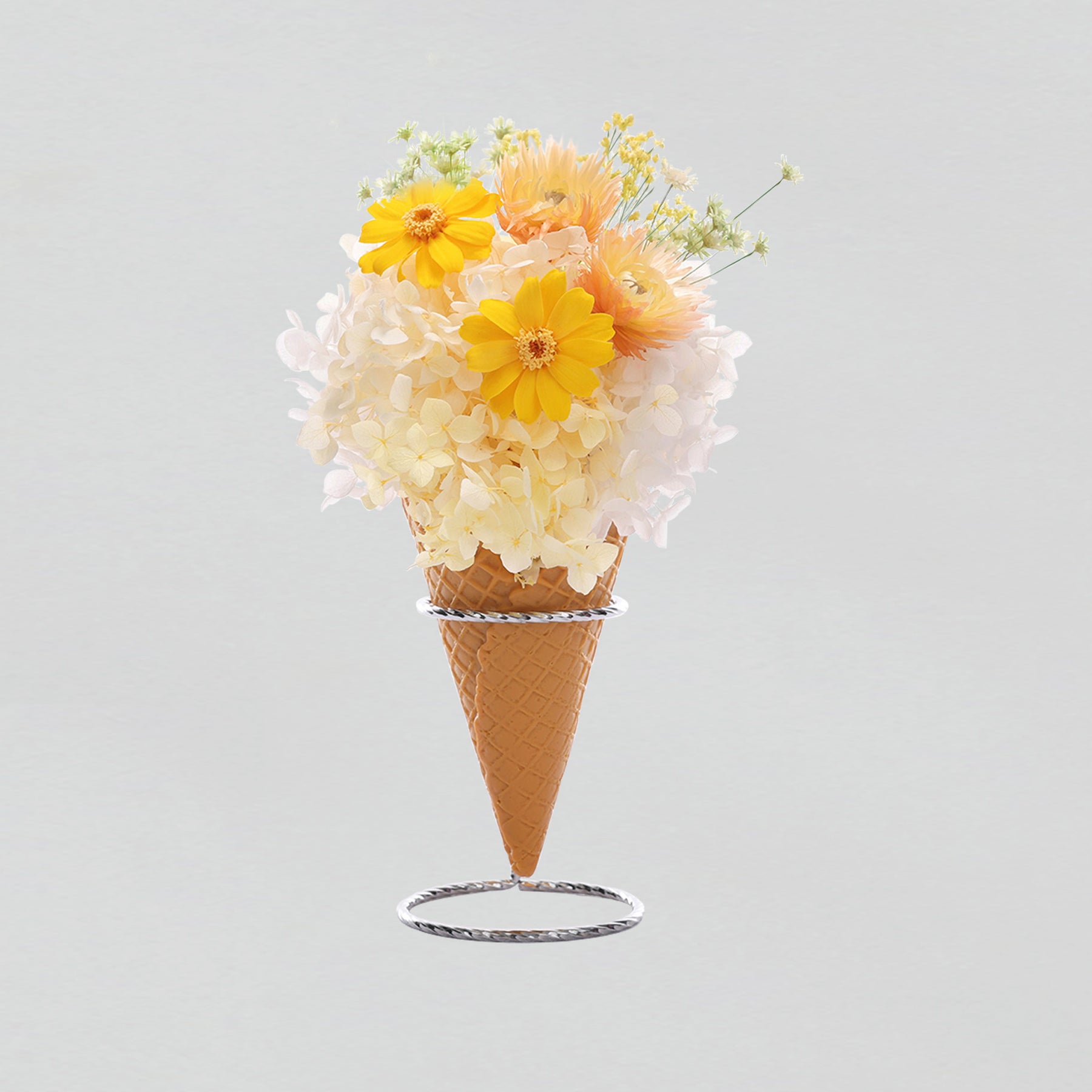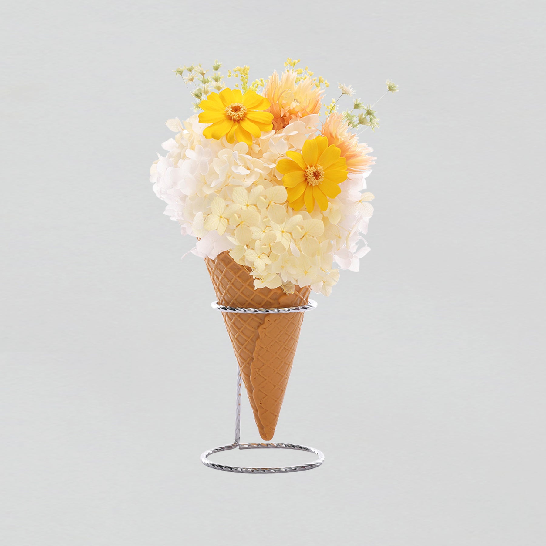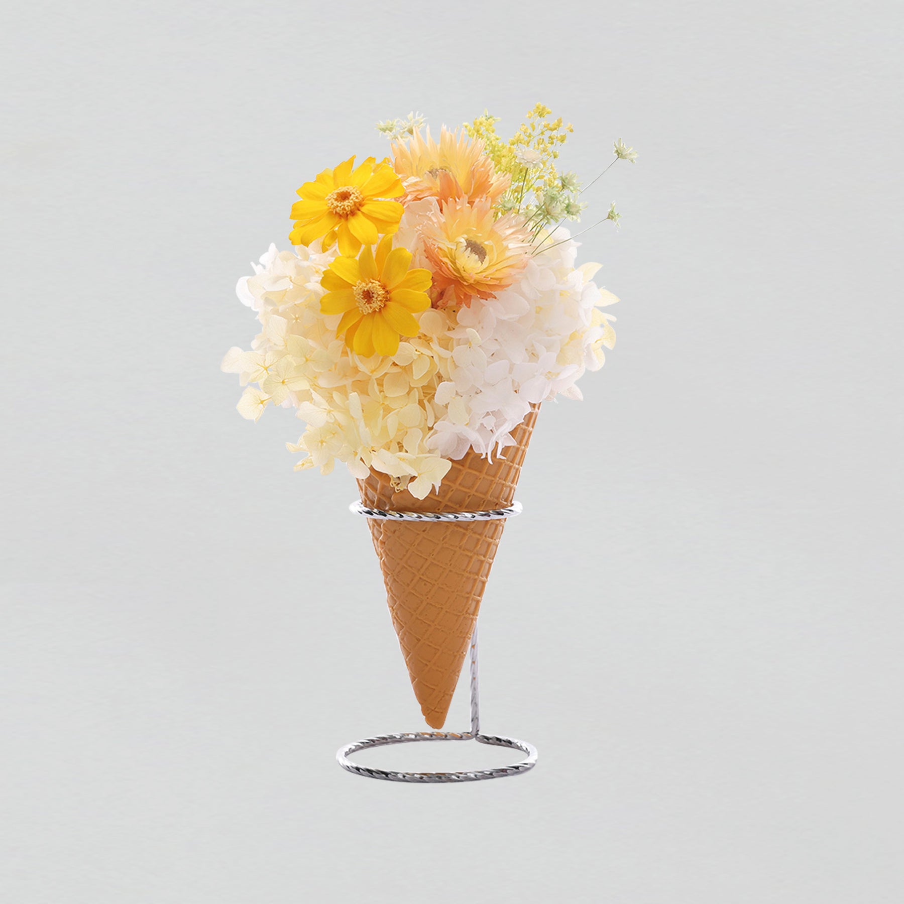 An ice cream cone stand that transforms the bouquet into a sweet memento, prolonging the delight of this truly special floral creation