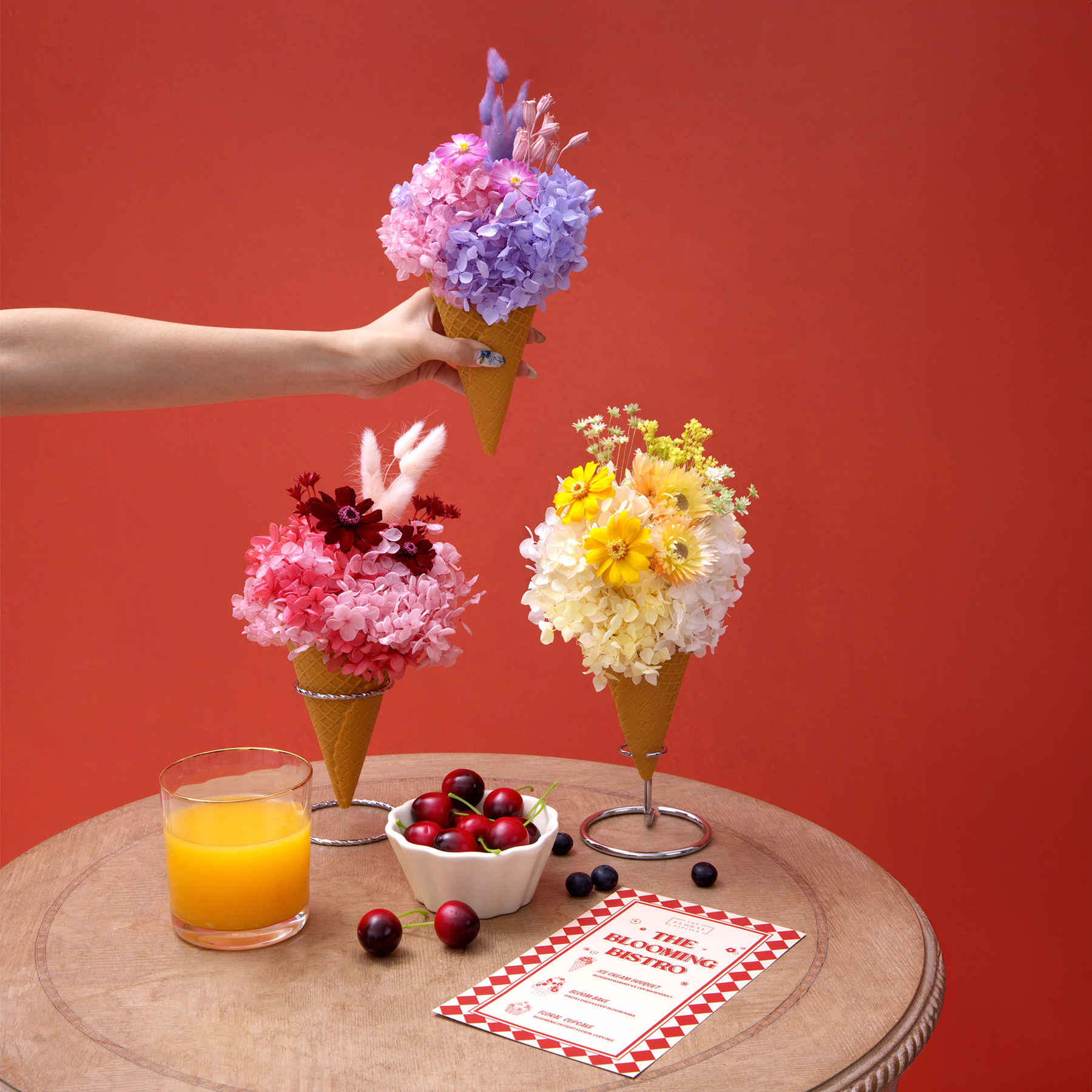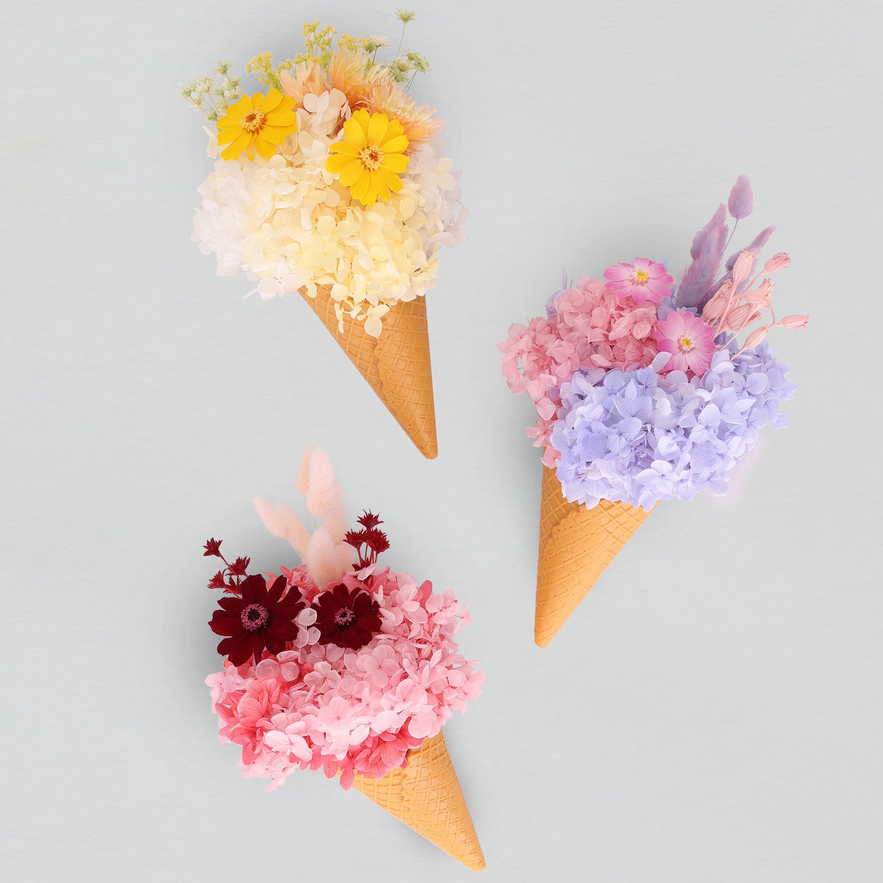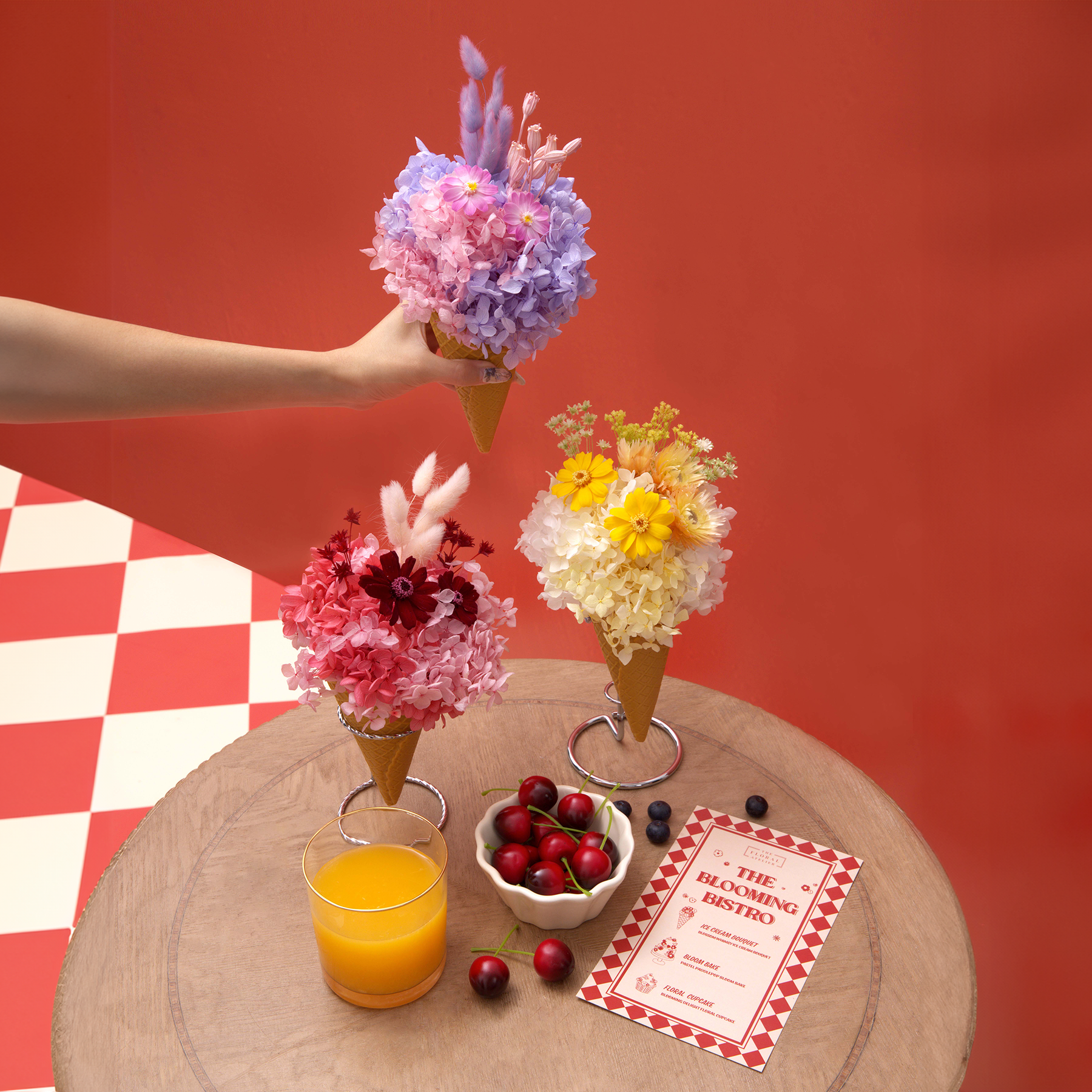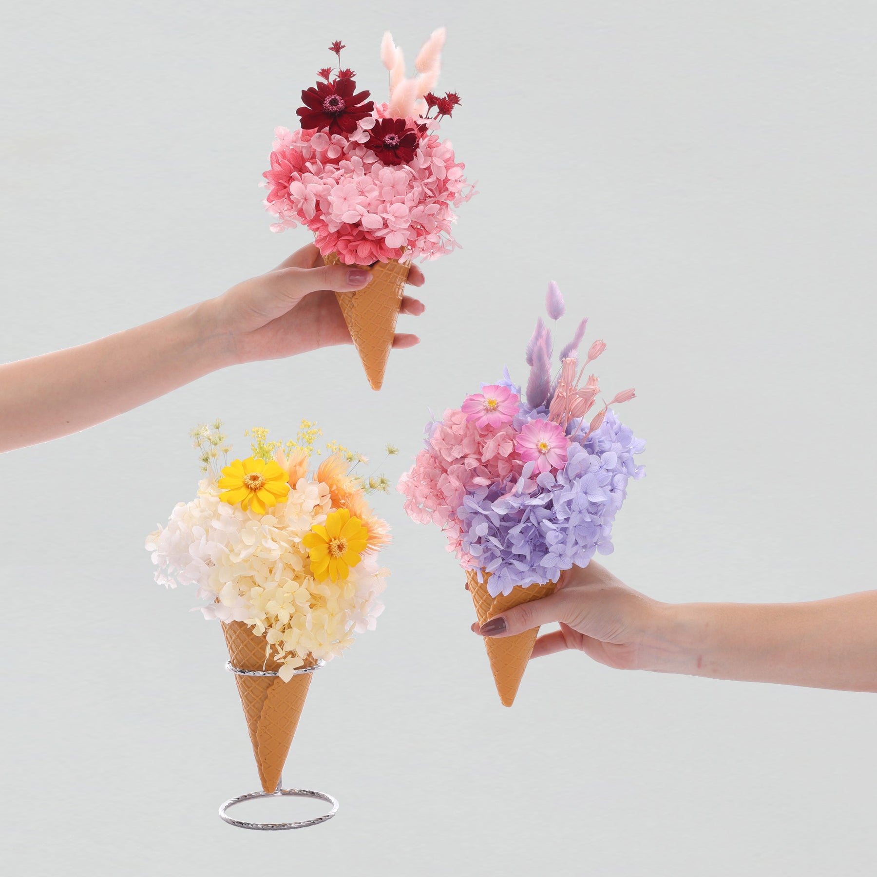 An ice cream cone stand that transforms the bouquet into a sweet memento, prolonging the delight of this truly special floral creation
