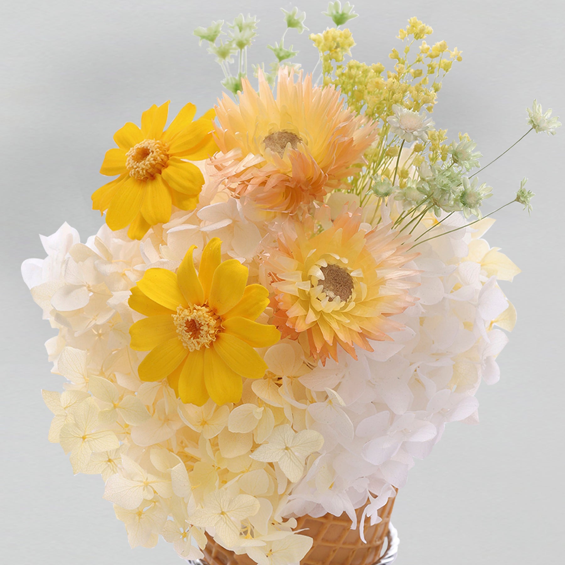 The Ice Cream Bouquet combines soft, delicately arranged blooms in a playful and elegant display, capturing the sweet joy and light-hearted charm of indulgence. Like a gentle scoop of your favourite buttercup ice cream, this arrangement pairs soft, warm-toned eternity florals in a sweet and serene bouquet.