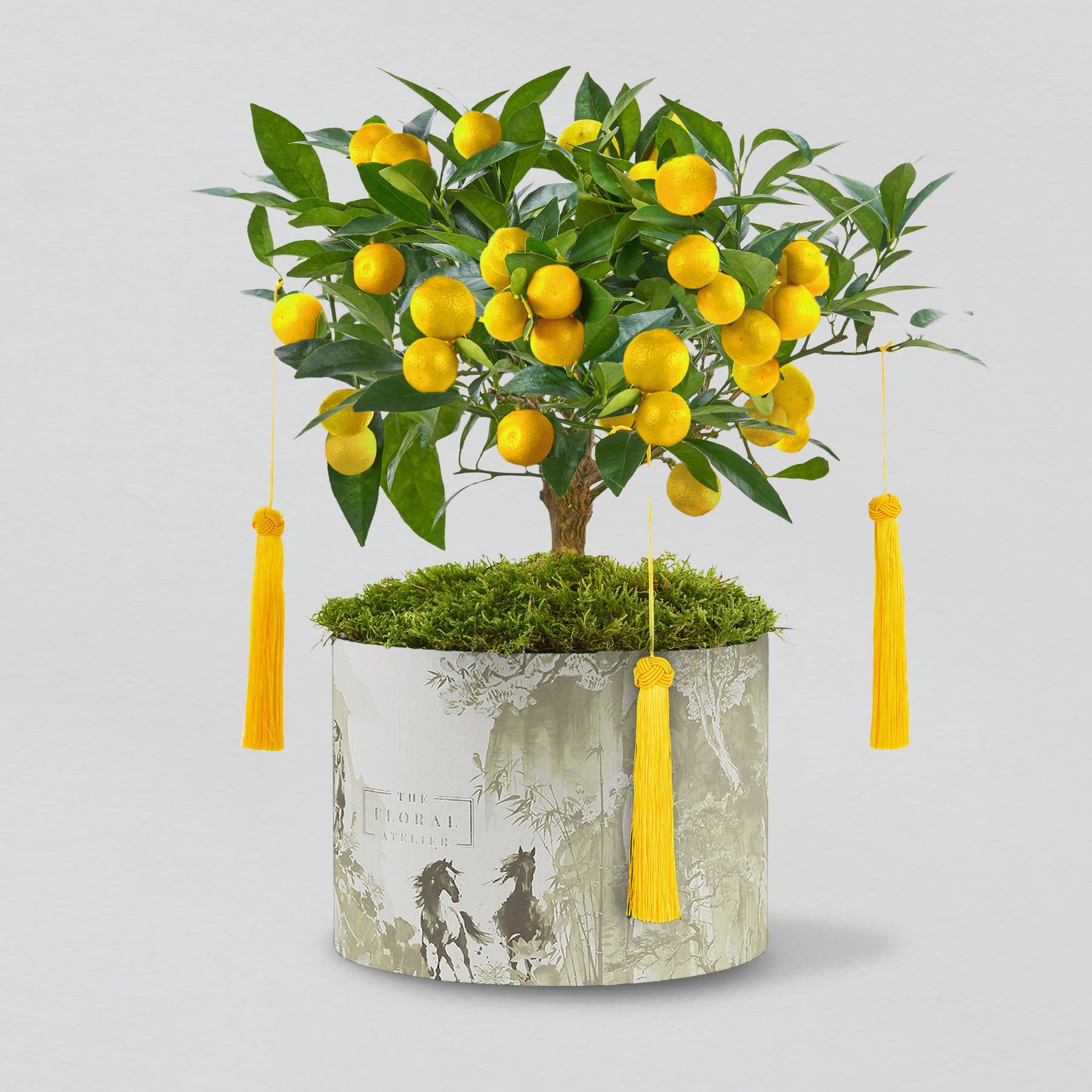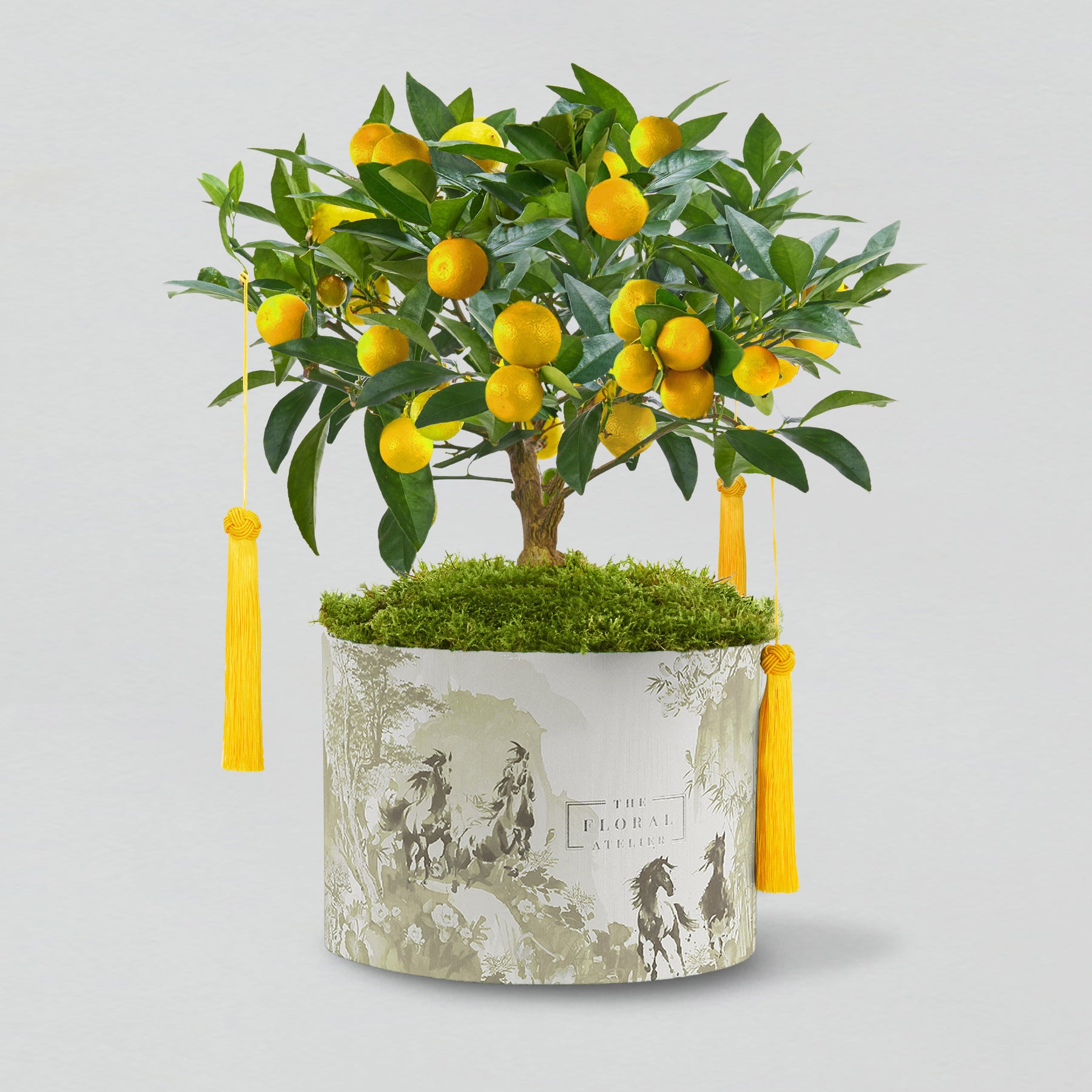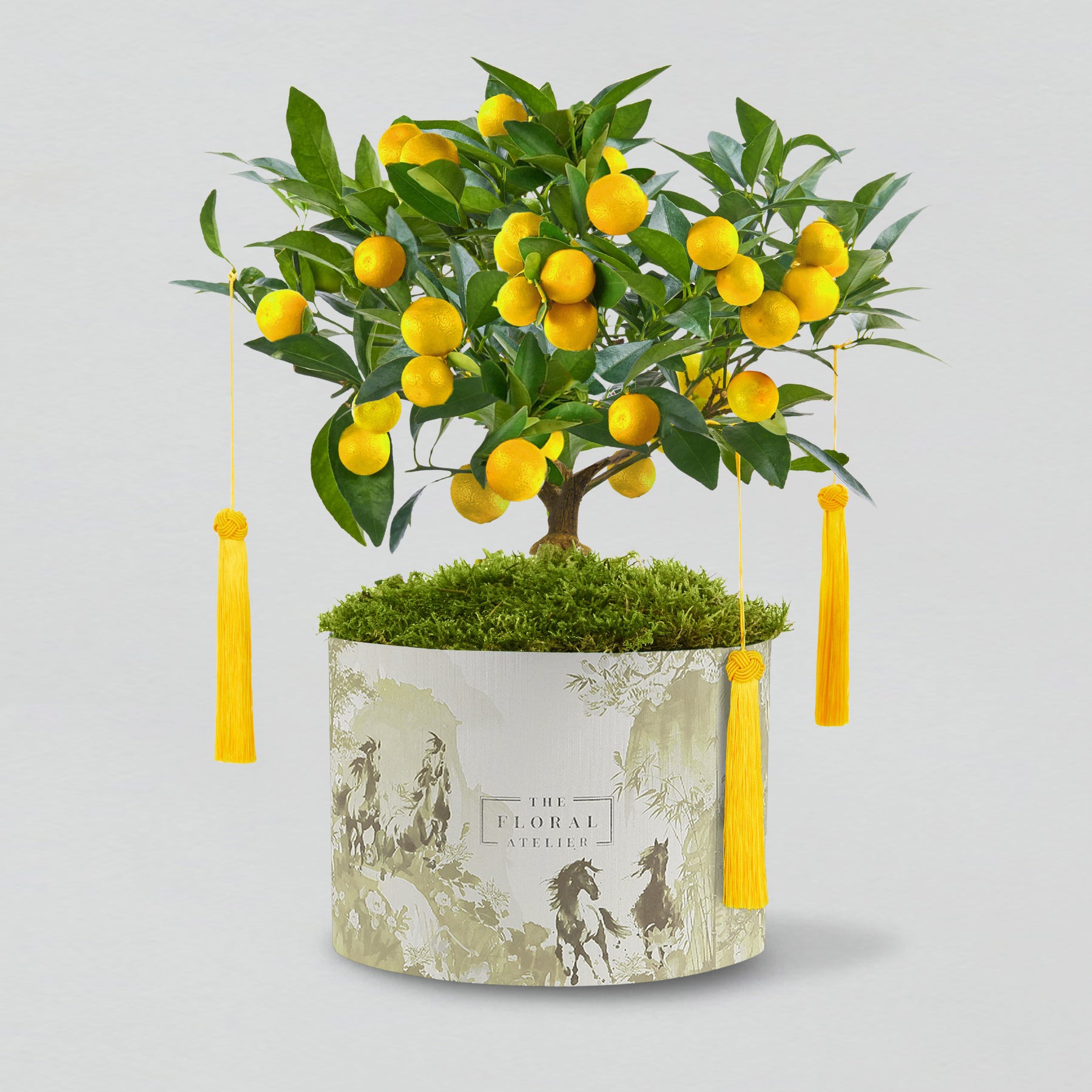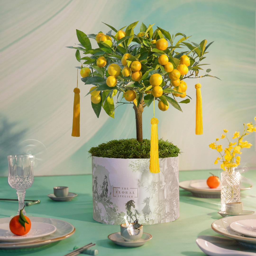 Usher in the Lunar New Year with the Happiness Mandarin Tree, a vibrant symbol of Abundance, Prosperity, and Happiness. Adorned with golden mandarin fruits, this arrangement represents wealth and good fortune. Housed in our bespoke Jade Horse (玉马) Limited Edition bloom box, it is perfect for displaying or gifting, bringing festive cheer and auspicious energy to any space. Send your wishes for a prosperous year to your loved ones.