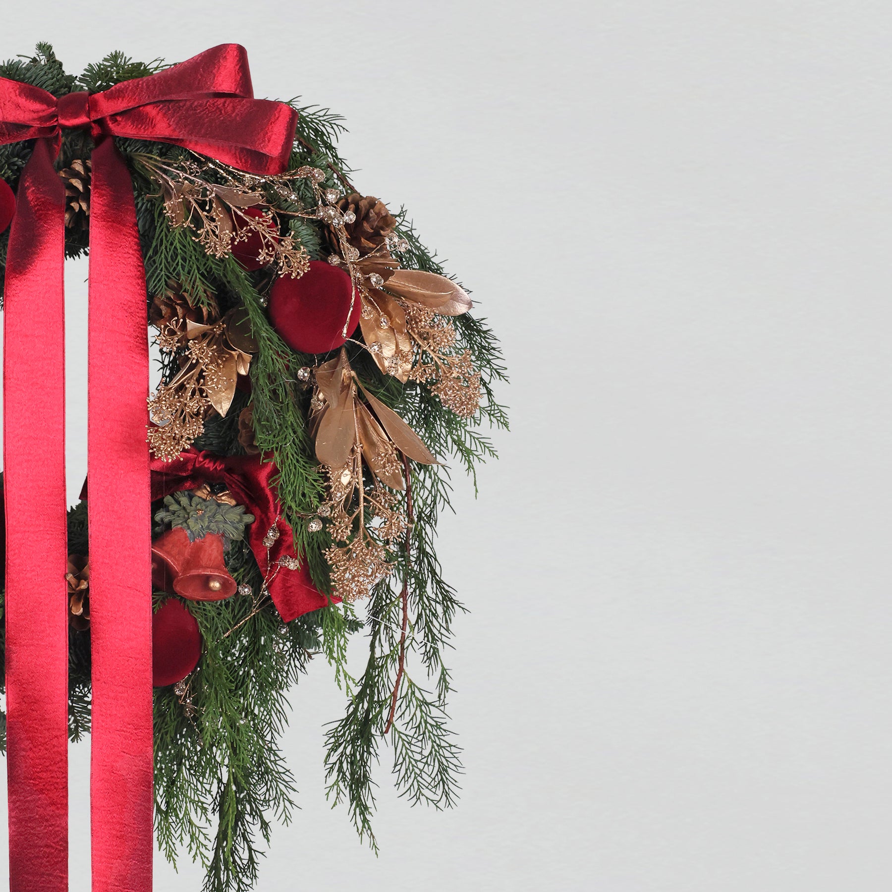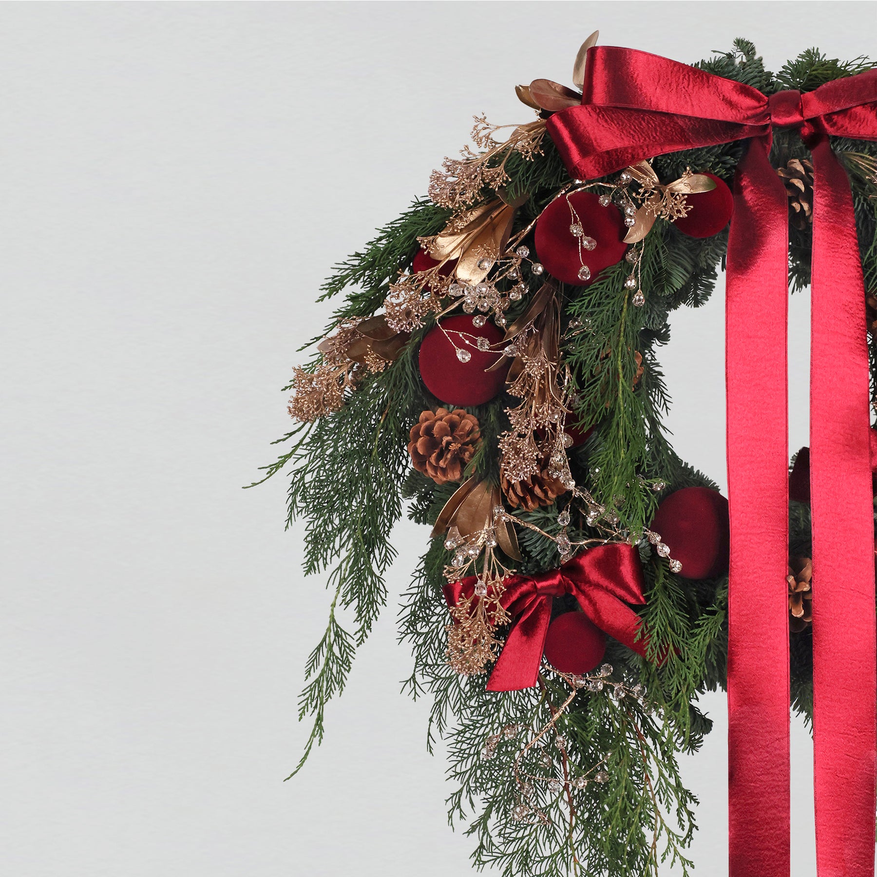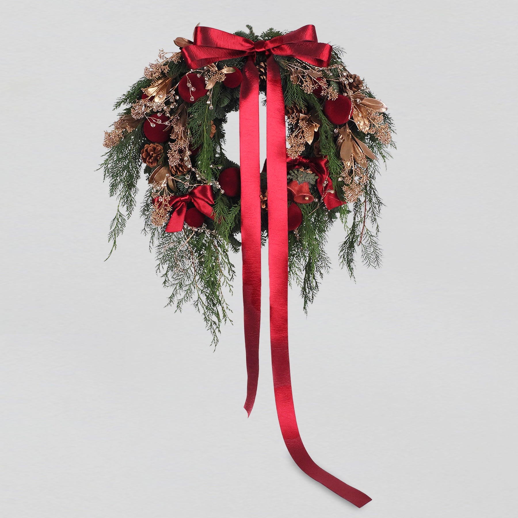 The Enchanted Moments Wreath tells a story of festive wonder. Vibrant crimson florals, rich greenery, and pinecone accents are woven together with luxurious satin ribbons, evoking the joyous colours and subtle sweetness of a holiday sweet shop. Each detail has been carefully curated to radiate warmth, elegance, and the cheerful spirit of the season.
