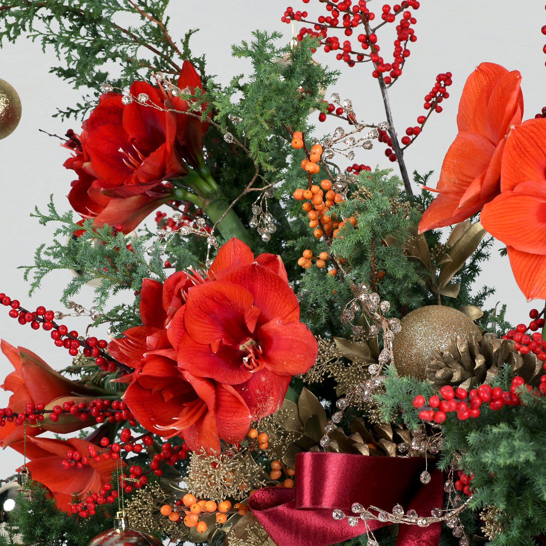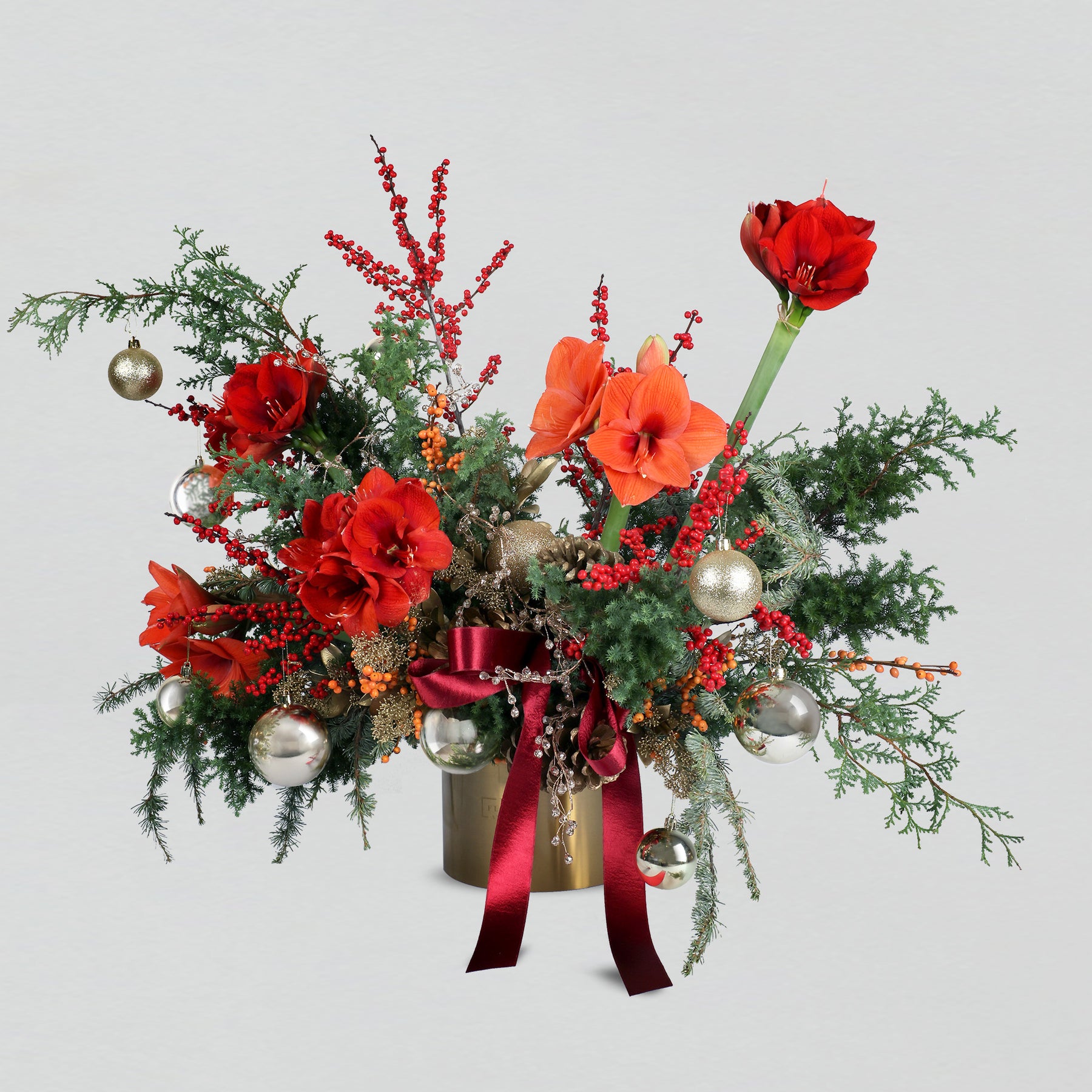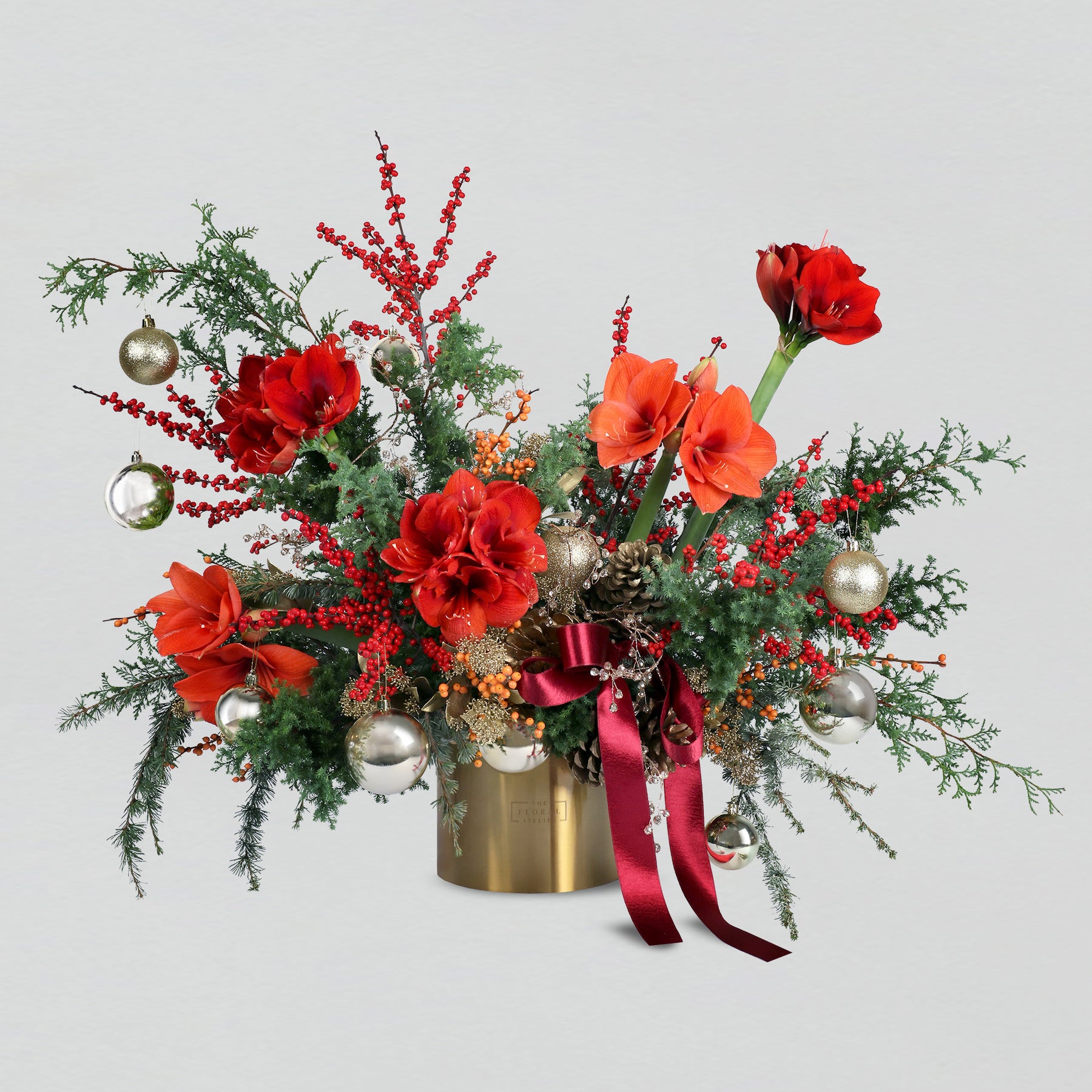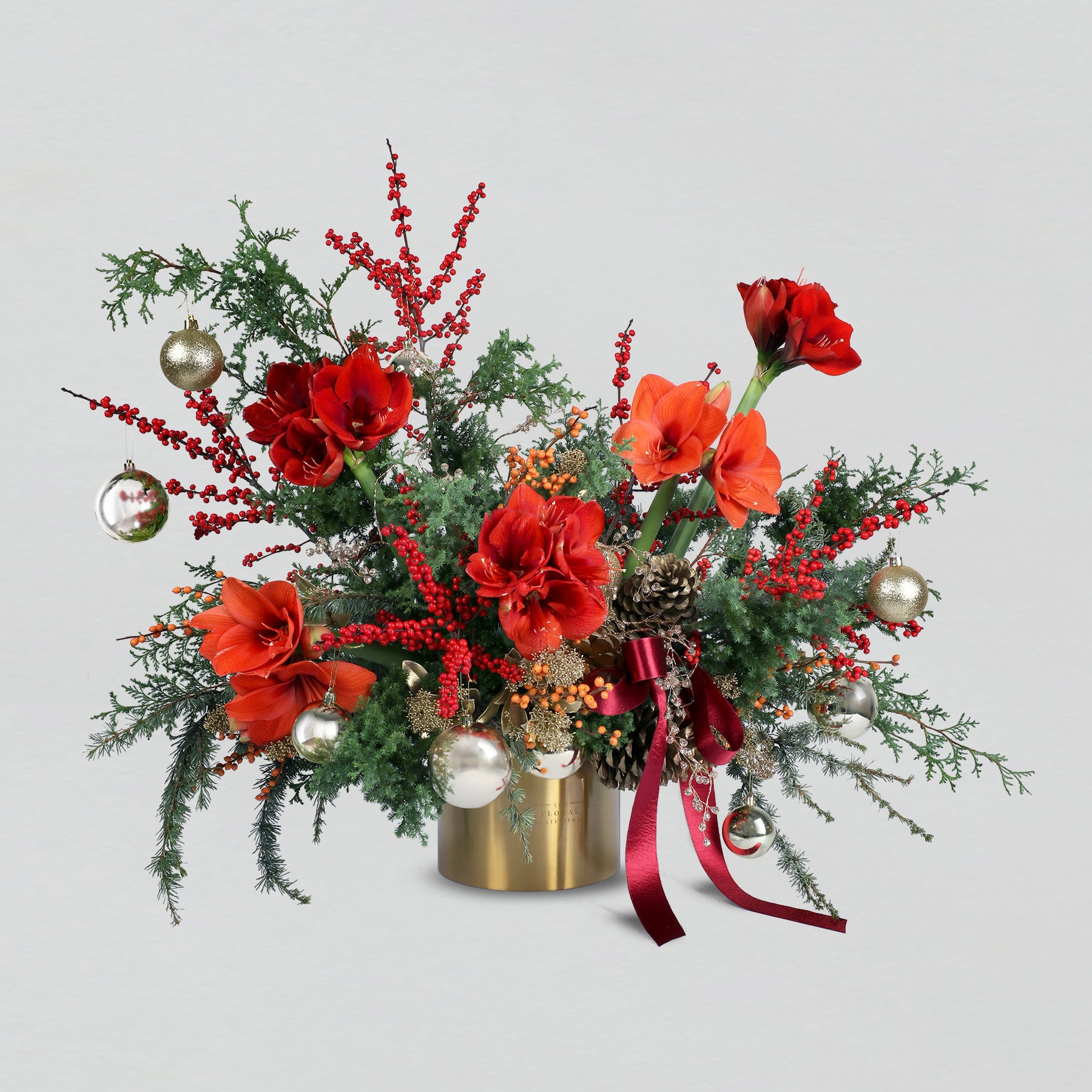 Perfect as a centerpiece or distinguished gift, this arrangement fills any space with cozy charm, refined beauty, and a touch of holiday delight, inviting moments of celebration and quiet wonder throughout the season.