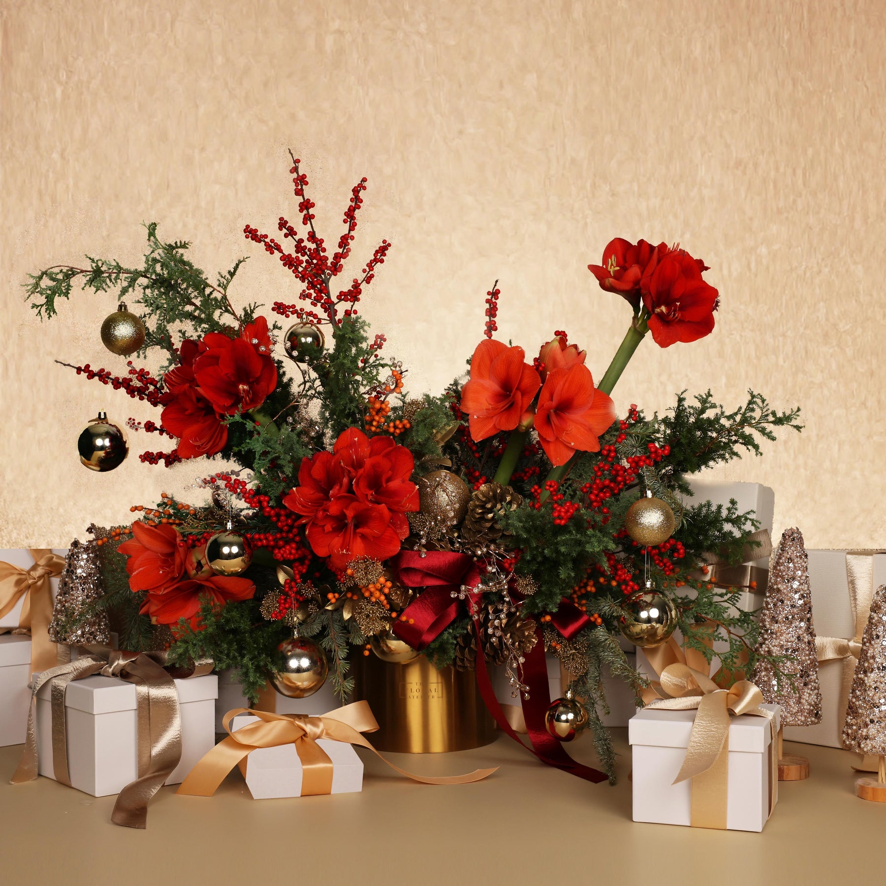 The season comes alive with the Happily Ever After Master Series, where rich red Amaryllis, gilded accents and silken ribbons are arranged in layers of playful movement and joyful bursts of colour. Intricate layers of texture and shimmer unfold across the arrangement, telling a story of cozy nights, twinkling lights, and holiday enchantment.