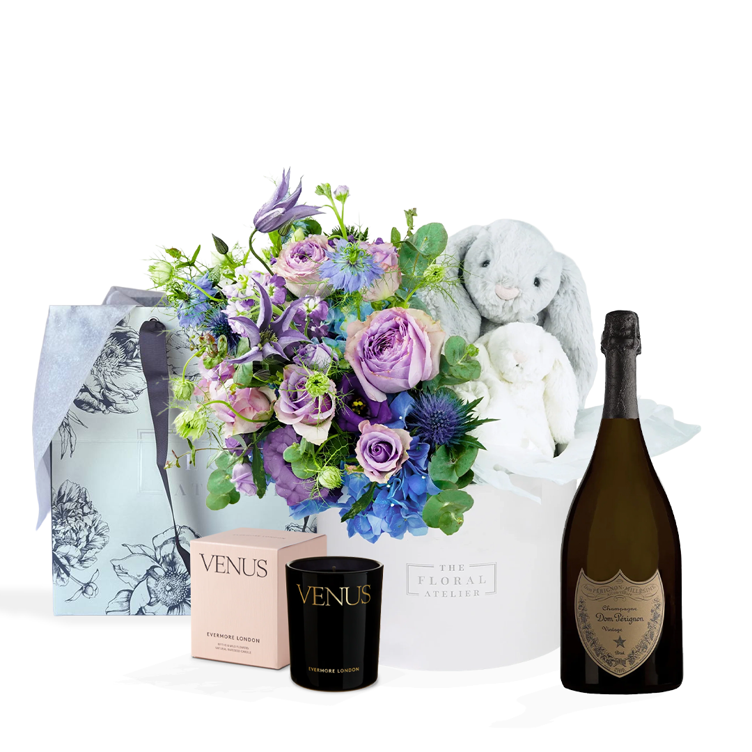 Celebrate the arrival of a little one with our intimate Joyful Abundance Gift Set. Choose between the charming Prince Bloom Box or the delightful Princess Bloom Box, each lovingly paired with a cuddly Jellycat soft toy and seasonal blooms in cheerful purples and blues. This joyful collection also includes a bottle of bubbly Dom Perignon Champagne and the sweet, floral scents of EVERMORE LONDON’s Venus Candle—A worthy celebration that stands above all else!