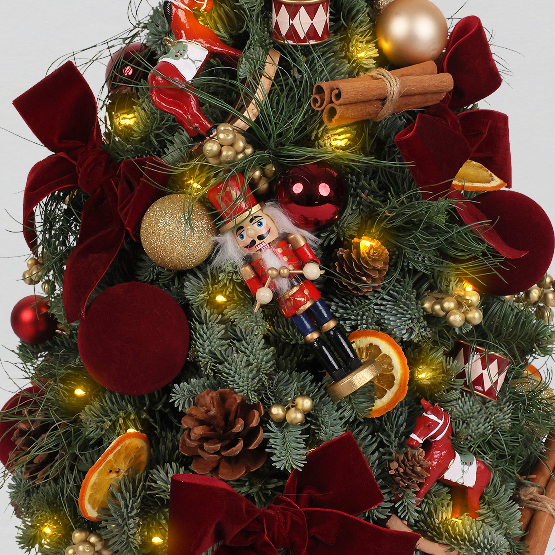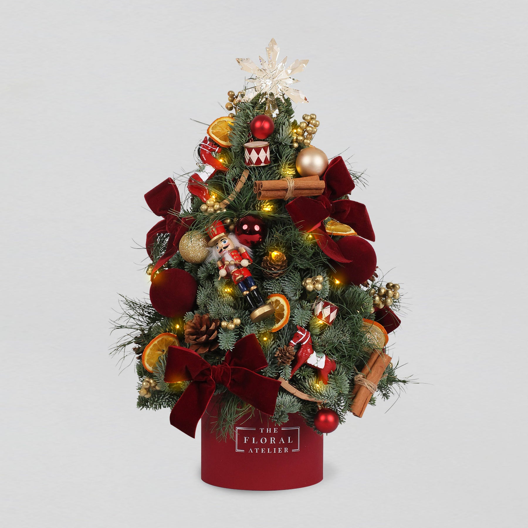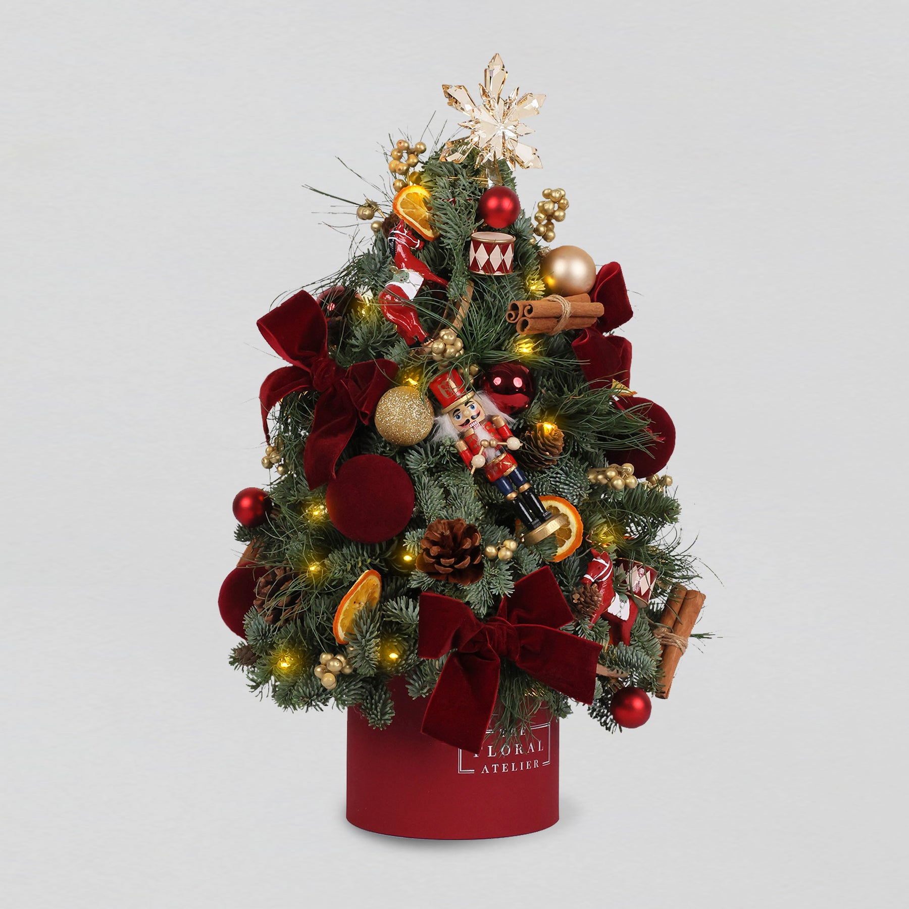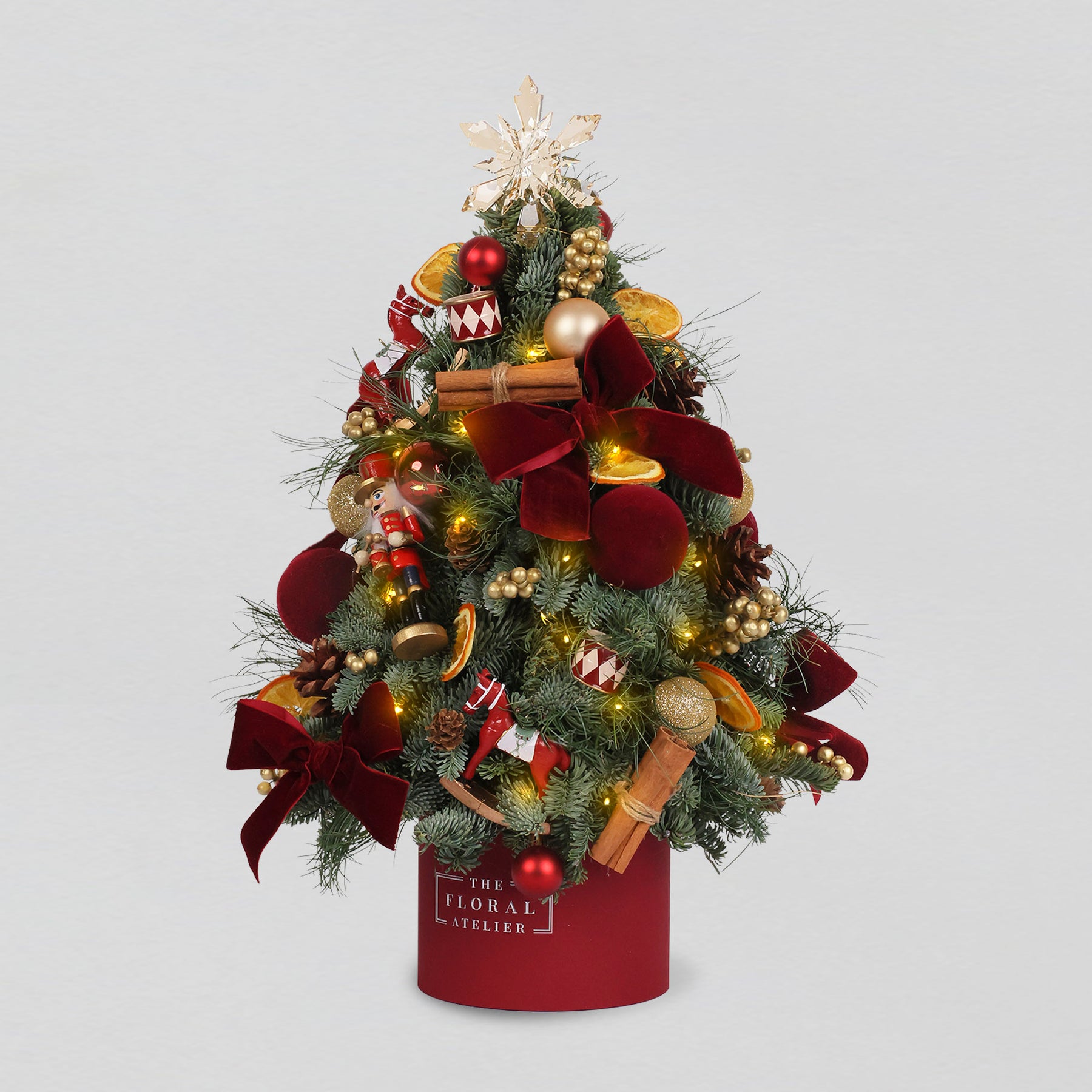 Step into a festive scene with A Holiday Tale Petite Christmas Tree, where deep crimsons, lush evergreens, and antique golds mingle like treasures from a holiday wonderland. Whimsical ornaments and aromatic cinnamon sticks peek through the branches, creating a playful yet sophisticated tableau that evokes the sights, scents, and joy of the season.