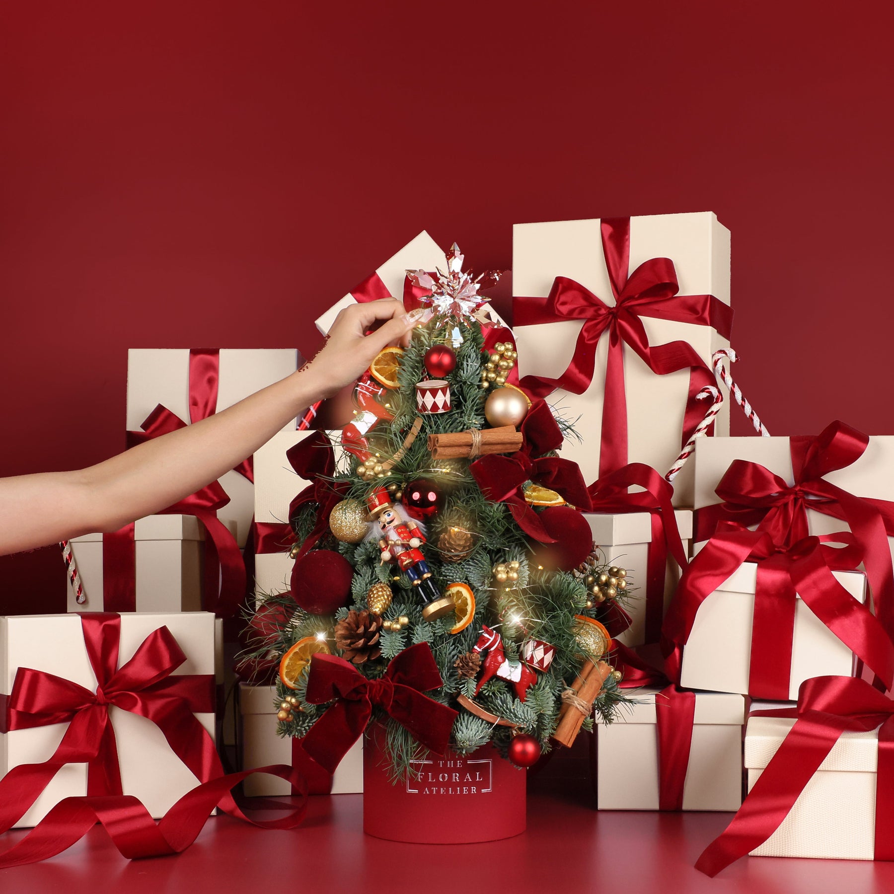 Encased in our signature bloom box, this petite tree captivates with its hues, textures, and the comforting scent of cinnamon. Perfect for gifting or adding to your décor, it evokes the magic and joy of the season.