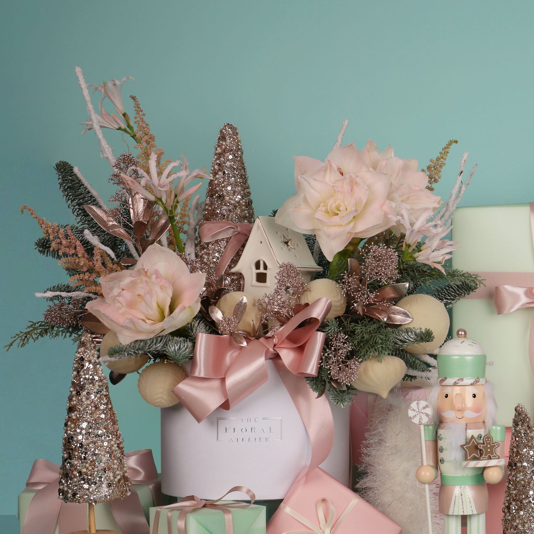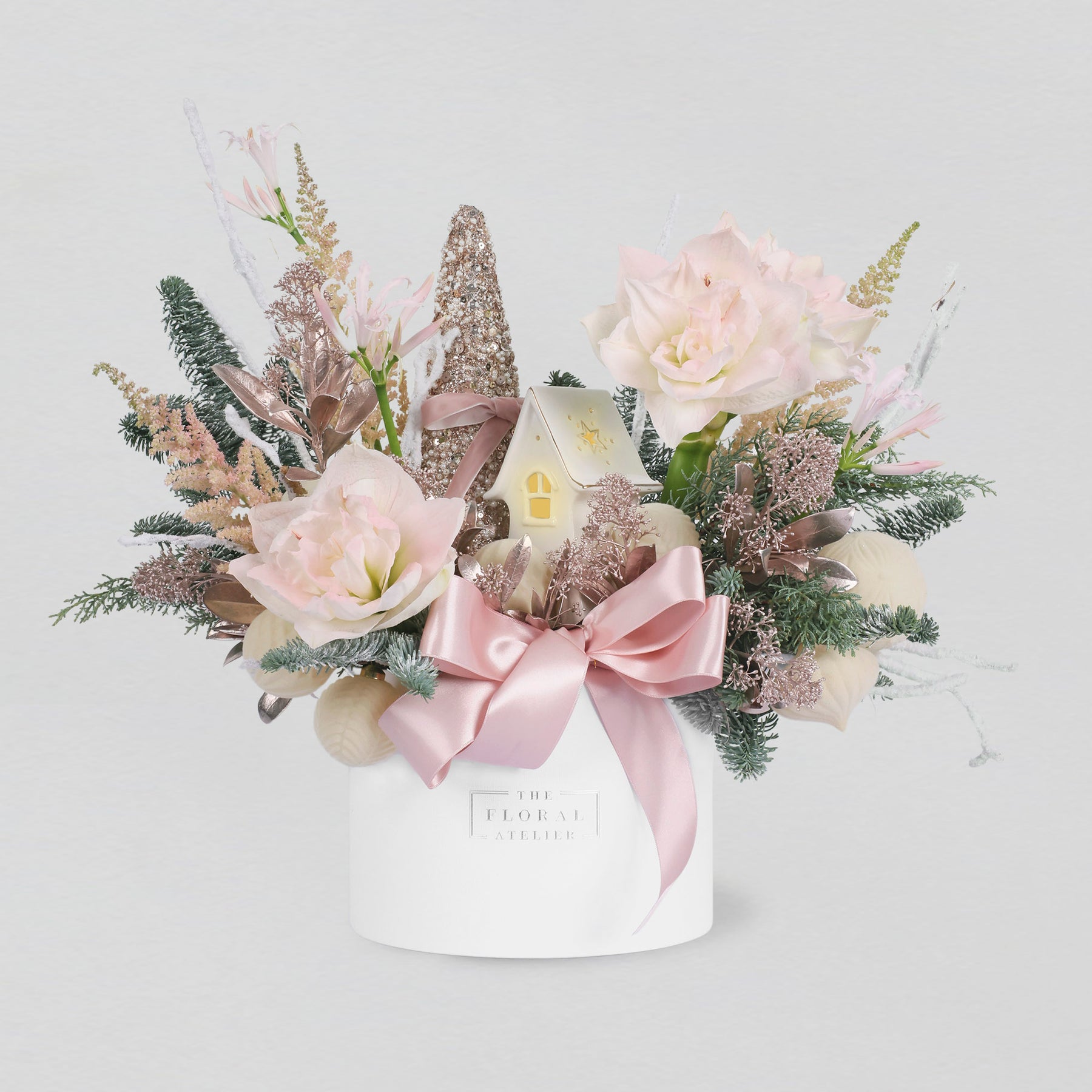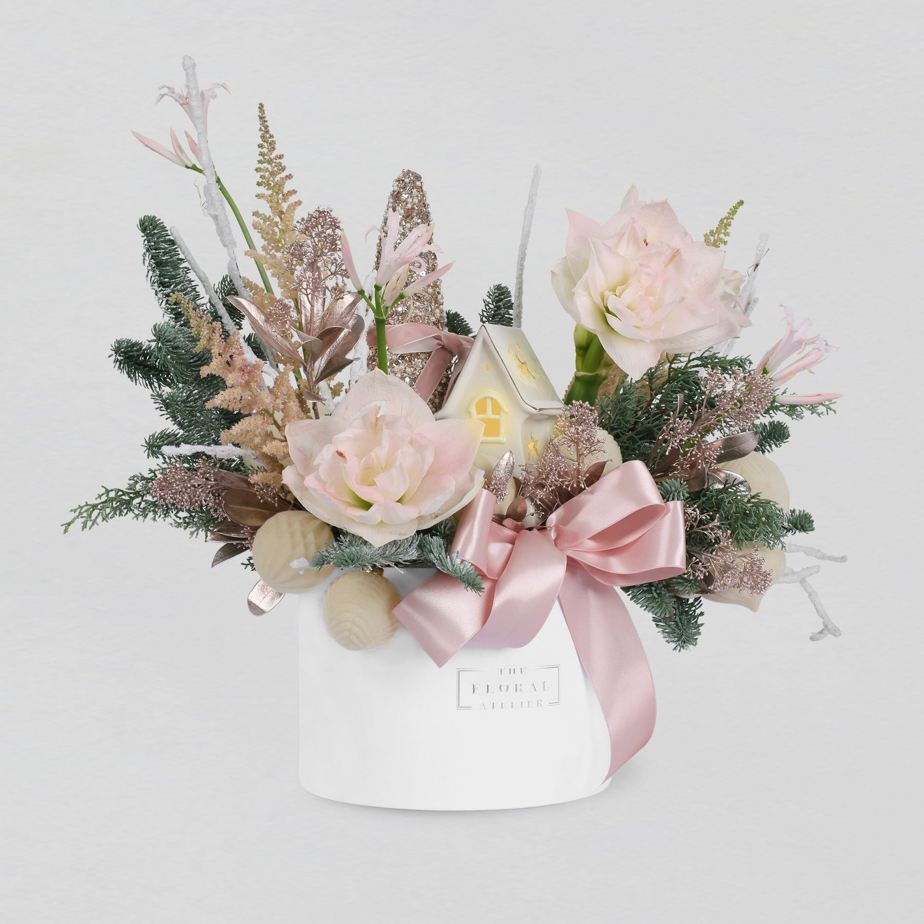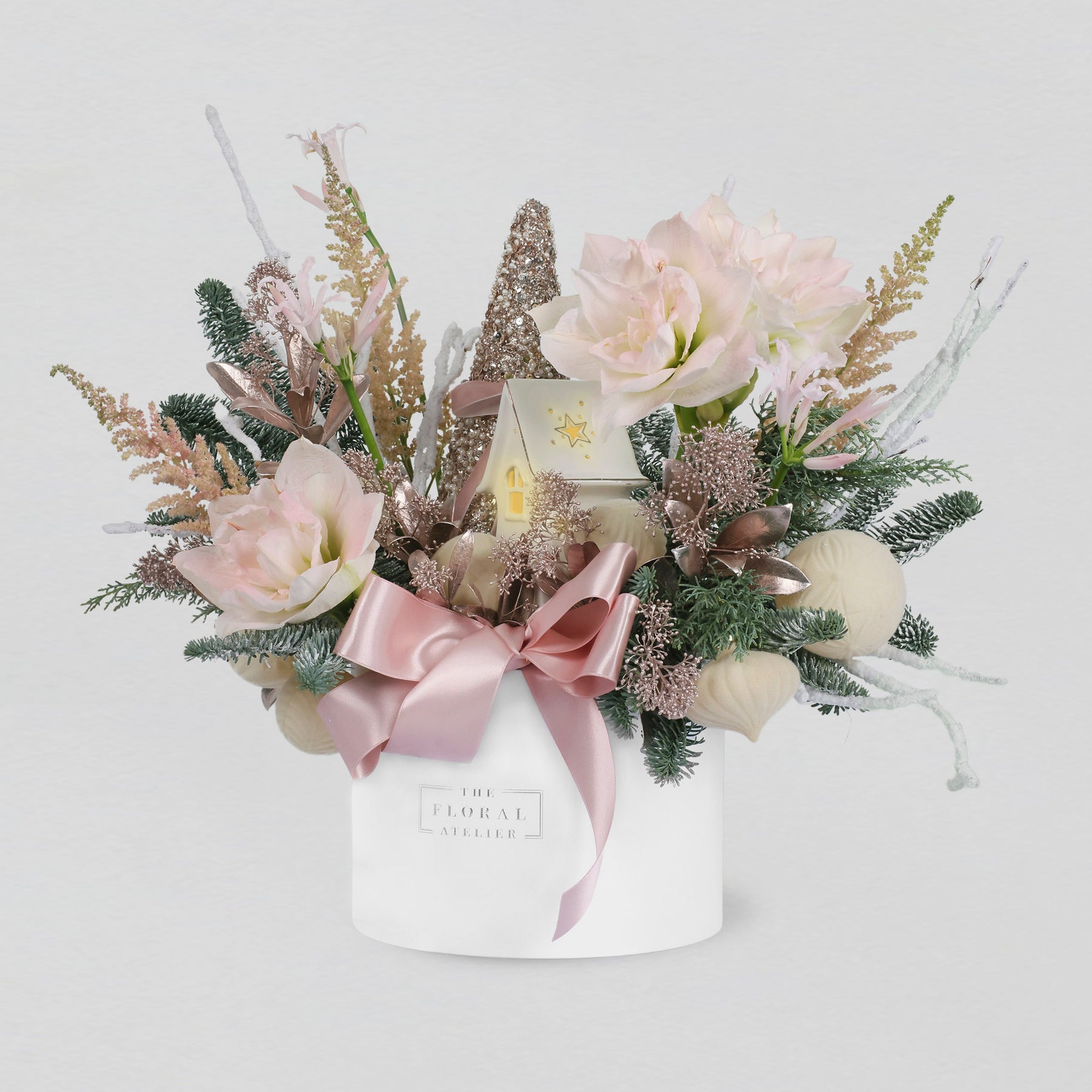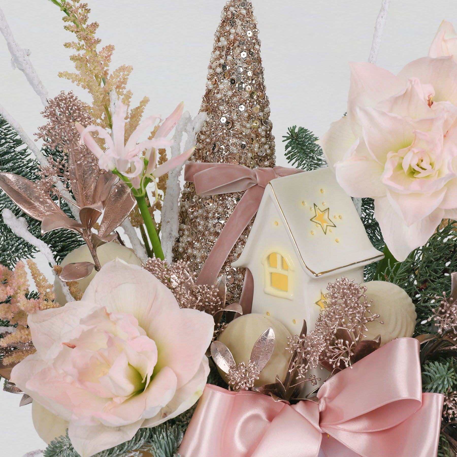 In the heart of the season, the Winter Dreams come true with soft blush Amaryllis and creamy blooms that unfold like treasures dusted with frost. Layers of rose-gold highlights and creamy pink amaryllis petals create a world of elegance and festive wonder, where every detail seems to glimmer with the joy and magic of the holidays.